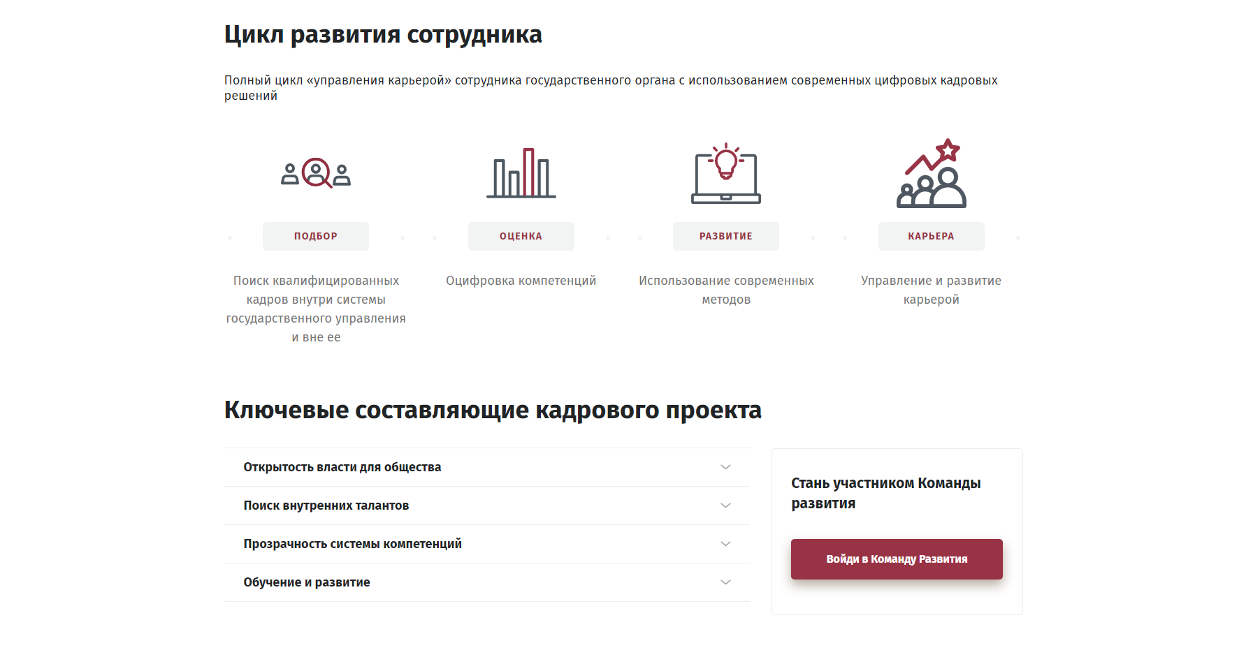 Напомним, войти в кадровый резерв правительства региона можно при помощи портала «Команда развития Камчатского края». Он был запущен по инициативе губернатора региона Владимира Солодова в октябре прошлого года. Воспользоваться сервисом могут жители всех субъектов Российской Федерации: получить предложения по развитию карьеры, ознакомиться с вакансиями на госслужбе, мунслужбе, в подведомственных организациях Камчатского края и войти в резерв управленческих кадров.
